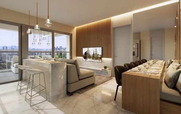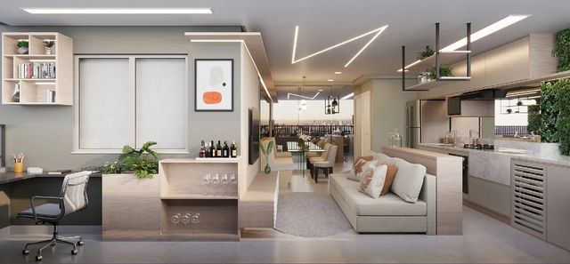 63 m² 2 vagas de garagem Sala e cozinha integradas e amplas 2 quartos, sendo 1 suíte Banheiro Social Sacada Gourmet