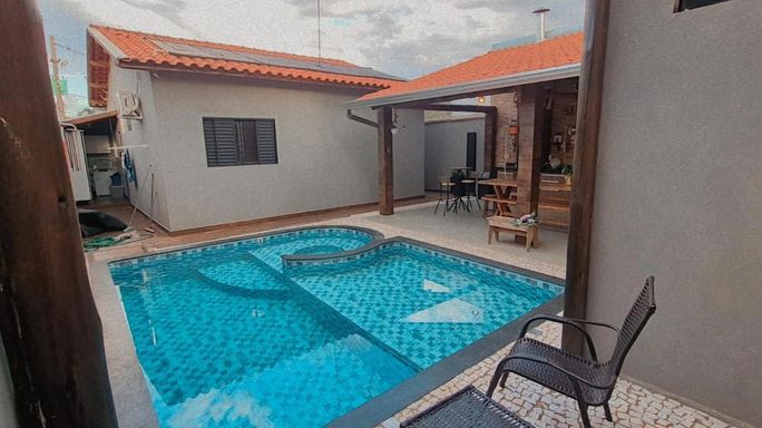 Lote 200 m² Área construída 164 m² 02 suítes Sala de TV Sala de Jantar Cozinha com armários planejados Área Gourmet Lavanderia Banheiro Externo Piscina Aquecida Aquecimento Solar Banho 02 Vagas Portão Automatizado