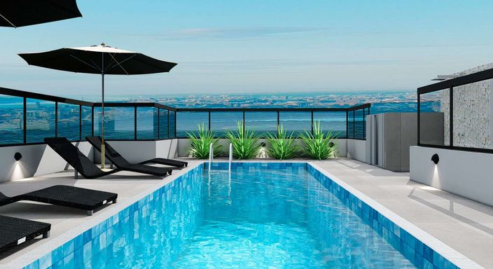Piscina na cobertura, sauna, churrasqueira, elevador