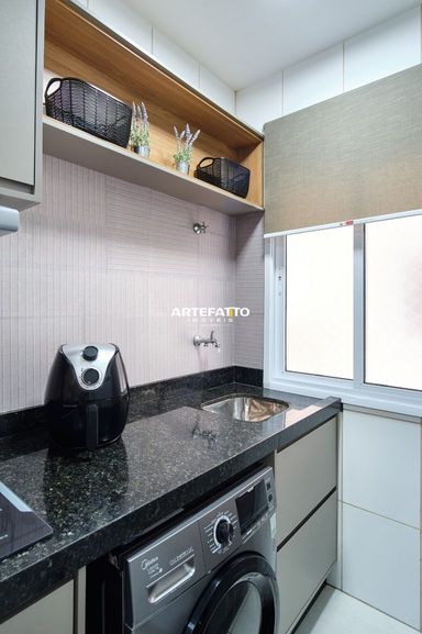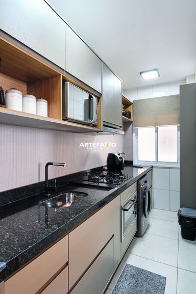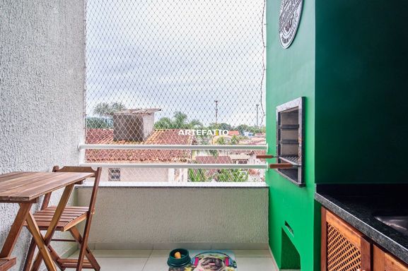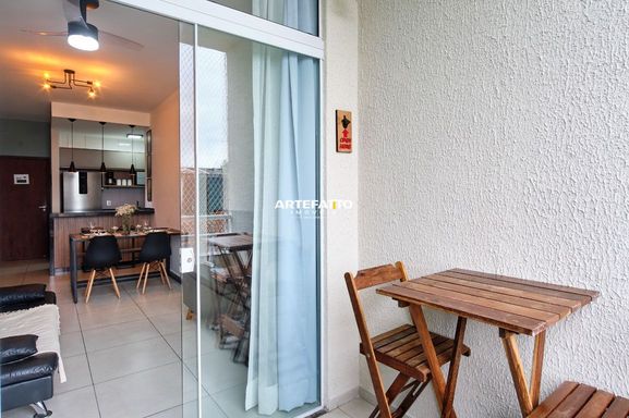 O apartamento conta com dois dormitórios, sendo um deles uma suíte, 1 banheiro social, sala de jantar conjugada com a de estar, varanda gourmet com churrasqueira e pia. Está todo mobiliado e equipado com utensílios domésticos.