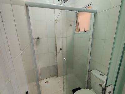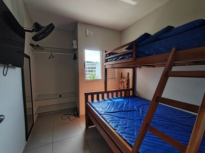 São dois dormitórios com prateleiras em vidro temperado e cabideiro o que apresenta uma maior facilidade para a higienização além de não se deteriorar com a umidade comum em regiões litorâneas.