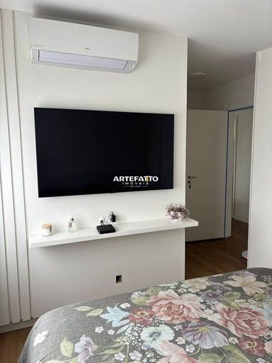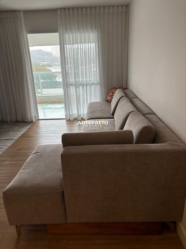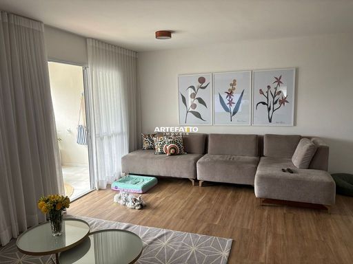 O projeto foi desenvolvido por arquiteto renomado, com acabamentos sofisticados, móveis planejados de alto padrão e pisos Portobello. A sala, com sofá em L e conceito moderno, proporciona um ambiente aconchegante e elegante.