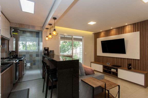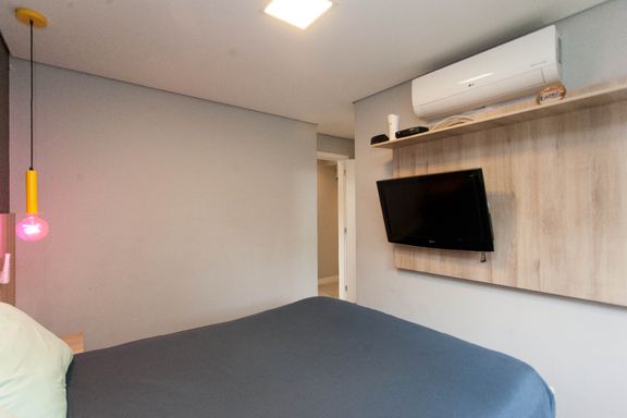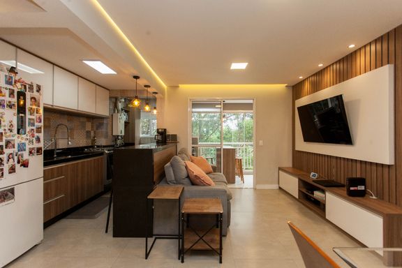 A sala de estar e jantar é ampla, bem iluminada e climatizada com ar-condicionado, além de contar com armários planejados que otimizam o espaço. Integrada à cozinha americana moderna, o ambiente convida à convivência e proporciona praticidade no dia a dia.