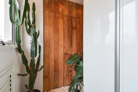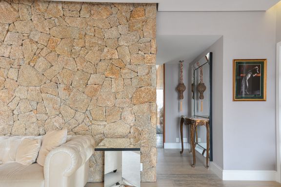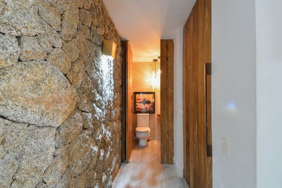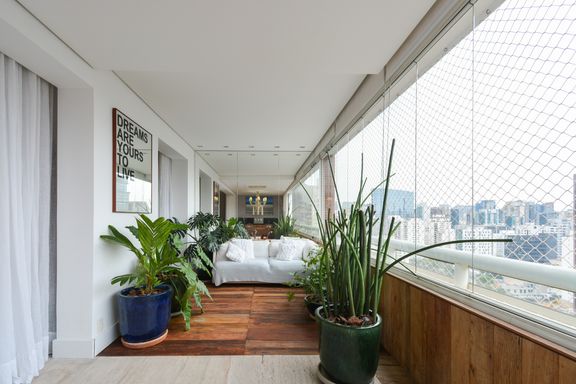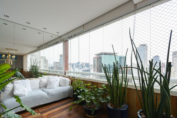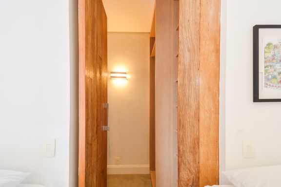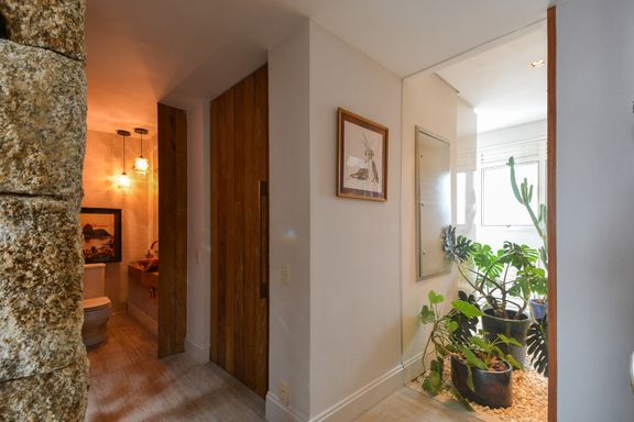 Materiais de alta qualidade foram cuidadosamente selecionados, como o mármore travertino italiano original, que se mescla com madeira de demolição nos decks, na parede da varanda, e nos acabamentos da suíte master e nas portas do closet e da entrada social. A iluminação natural é um destaque no projeto; por isso, o quarto de serviço foi eliminado, permitindo que a luz do jardim de inverno ilumine o interior do apartamento.
