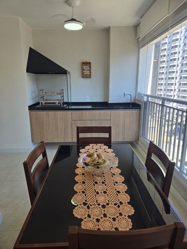 • Cozinha: armários planejados, geladeira, micro-ondas, cooktop com protetores de silicone, jogo de panelas específicas, mesa de 4 lugares