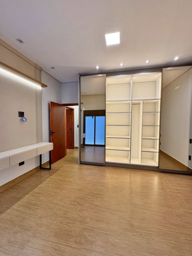 Suíte máster com closet, LED embutido e porta-balcão com persiana automatizada