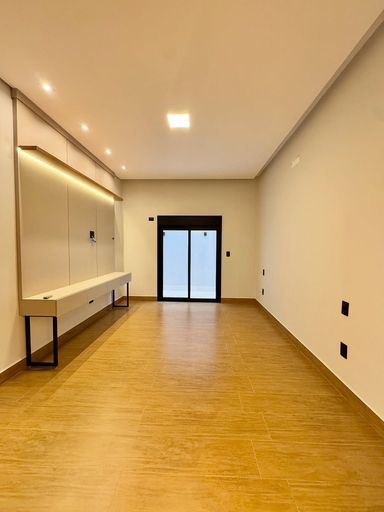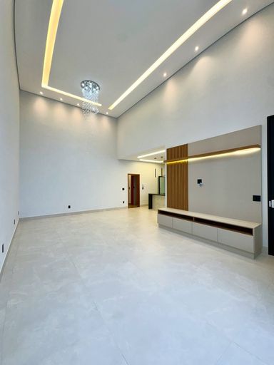 Sala com pé-direito alto, painel planejado e porta automática