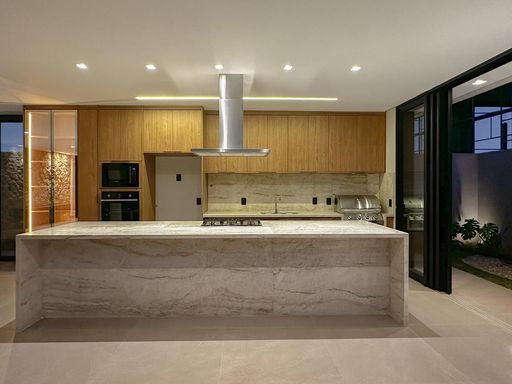 • Cozinha com ilha, cooktop, coifa e torre quente (forno + micro-ondas)