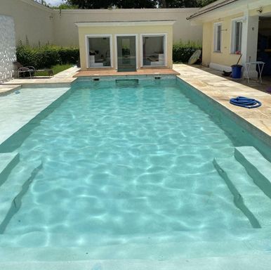 • Piscina com hidromassagem, prainha, degraus, iluminação, cascata e ligação direta à sauna (atualmente desativada);