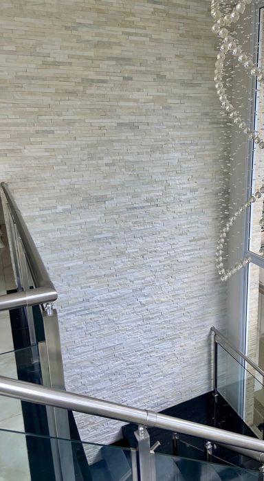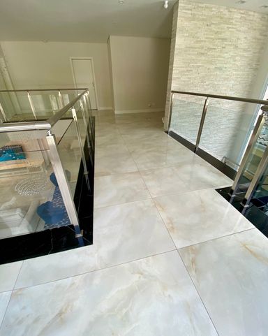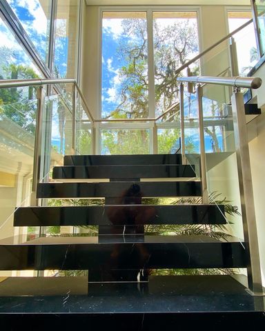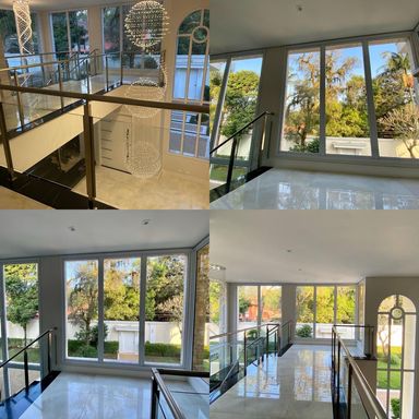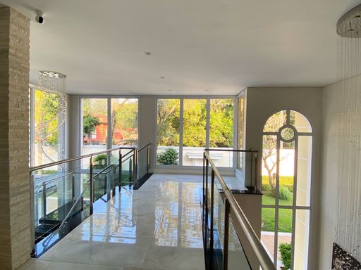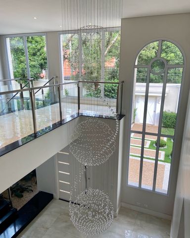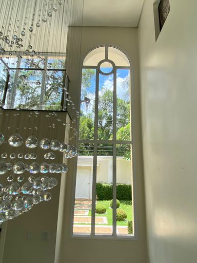 • Sala ampla com pé-direito duplo, janelas de vidro do piso ao teto e vitral arquitetônico;