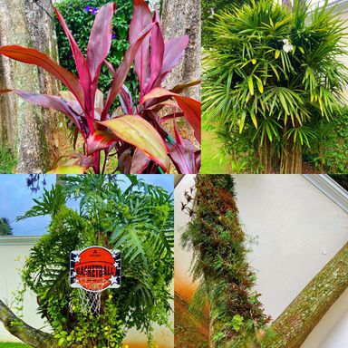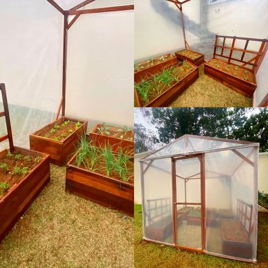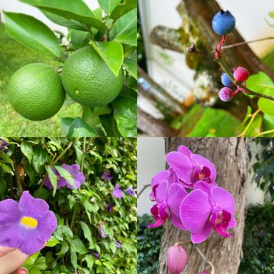• Jardim iluminado com varal de luzes, gramado amplo, árvores frutíferas e estufa de hortaliças.