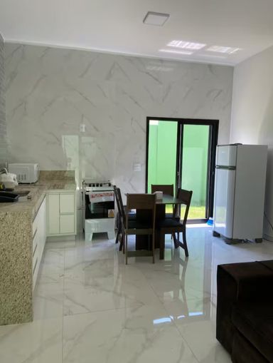 Área total do terreno: 250 m² Área construída: 163 m² 02 dormitórios Sala Cozinha 01 banheiro Varanda externa com churrasqueira à carvão Garagem coberta para 2 carros