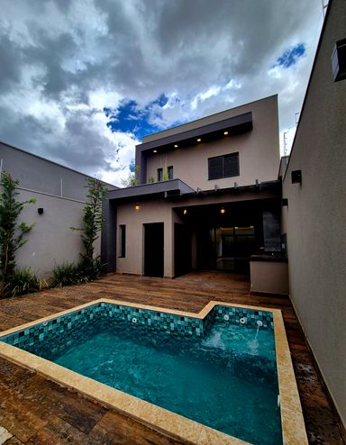 Terreno 180m² Construção 175m² 3 dormitórios, sendo uma suíte Closet Sala pé direito alto Copa Cozinha Lavanderia moderna Varanda gourmet Som embutido Garagem coberta 3 carros piscina aquecida automatizada digital cascata hidro Iluminação em led com vários lustres