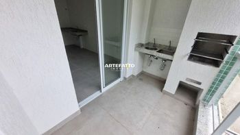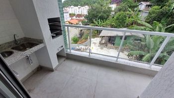 Sacada com churrasqueira : Espaço ideal para momentos de lazer com vista parcial do mar.