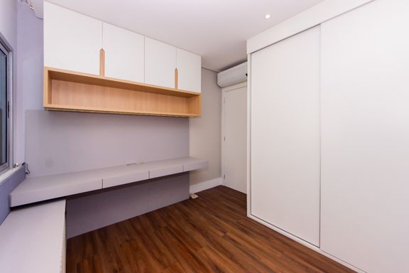 Os ambientes contam com piso em madeira, armários planejados e ar-condicionado em todos os cômodos, garantindo conforto e praticidade no dia a dia.