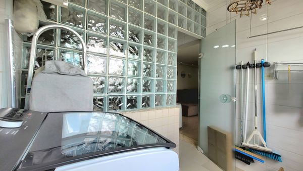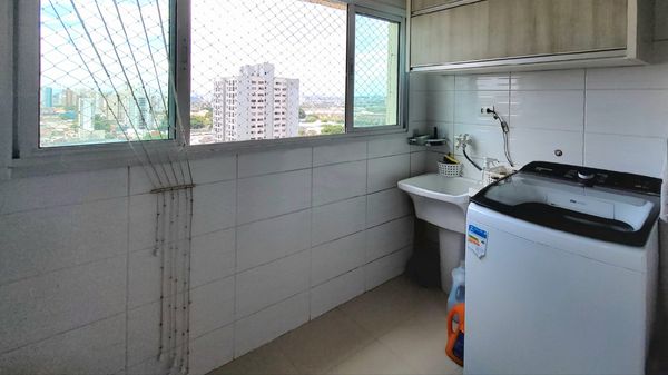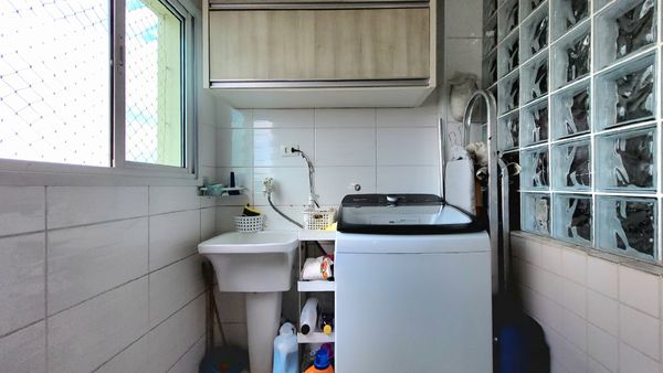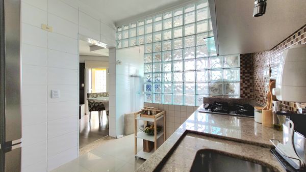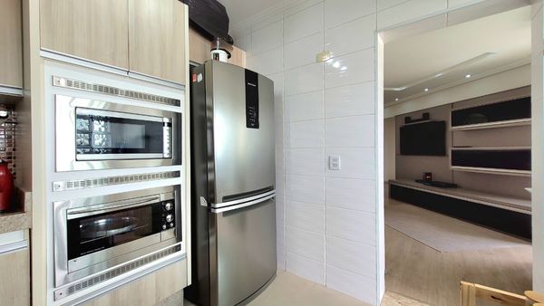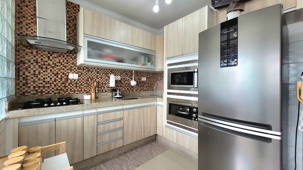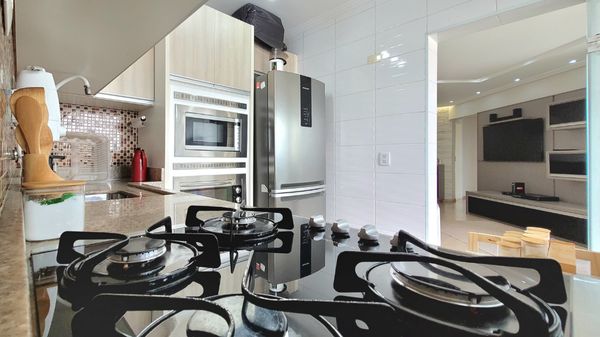 A cozinha é planejada e equipada, contando com fogão de mesa, forno e micro-ondas embutidos, oferecendo organização, eficiência e conforto para o preparo das refeições. A ligação prática com a área de serviço otimiza a rotina e facilita o uso do espaço.