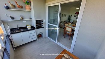 Cozinha aberta integrada a sala. O apartamento tem sacada com churrasqueira.
