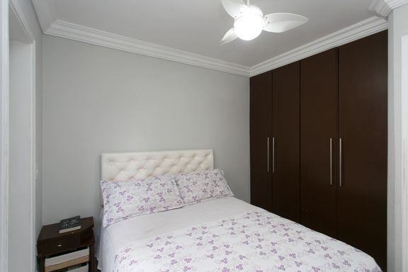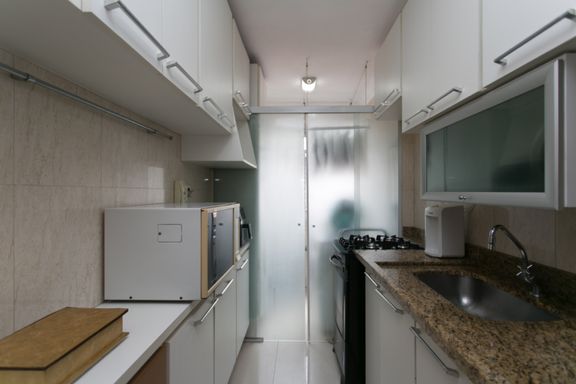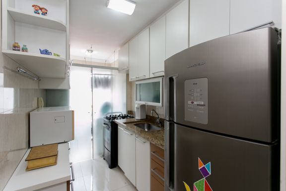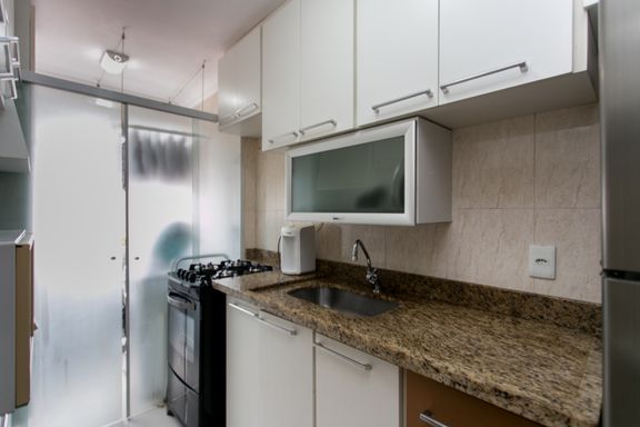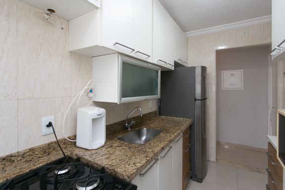A cozinha possui armários planejados, garantindo praticidade e organização no dia a dia. O apartamento oferece ainda 1 vaga de garagem coberta.
