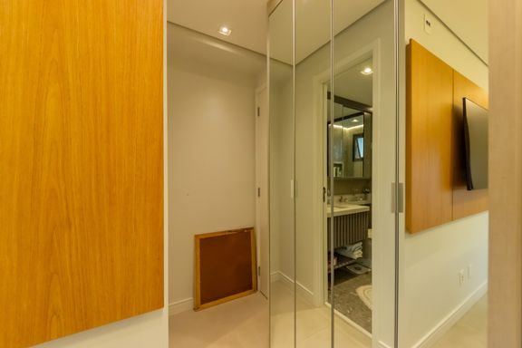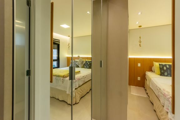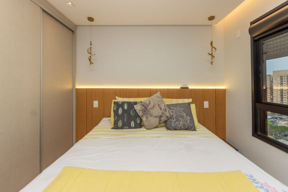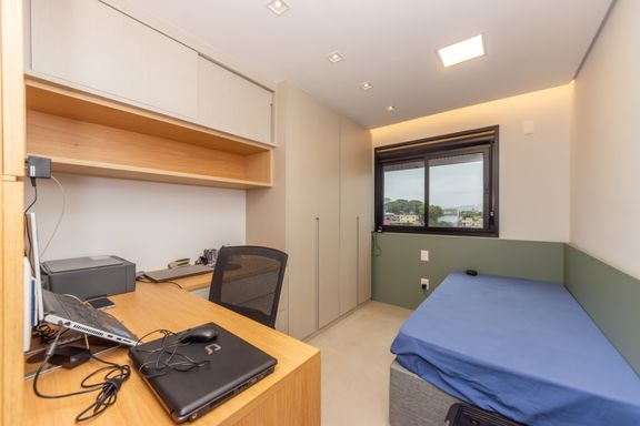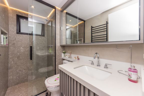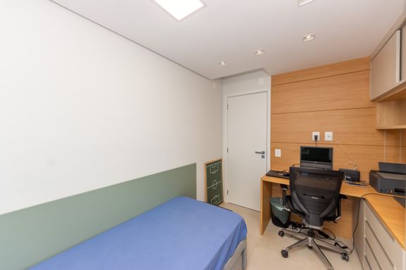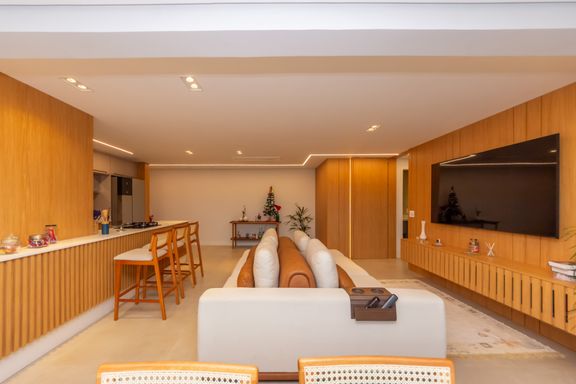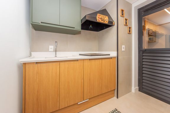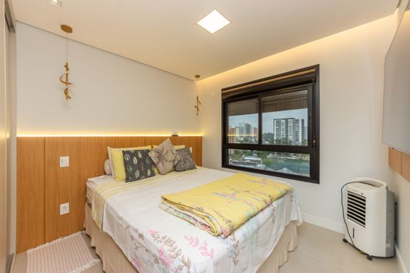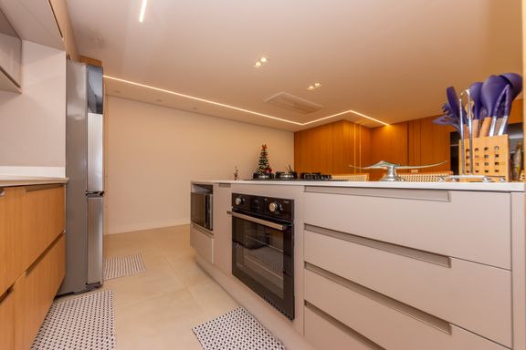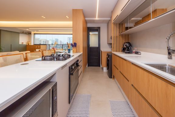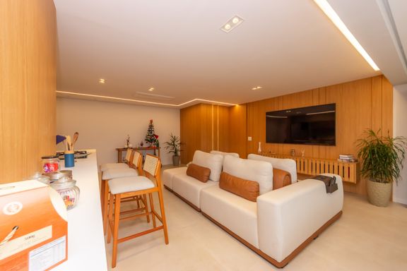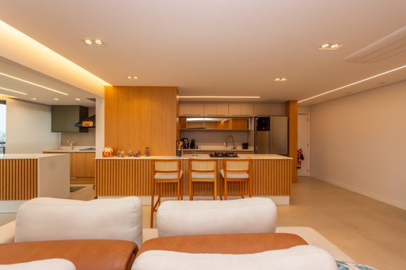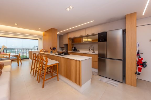 O destaque do imóvel fica por conta de seus acabamentos de alta qualidade, incluindo móveis planejados na cozinha integrada e ar-condicionado central. A área de serviço é funcional e bem distribuída, oferecendo comodidade no dia a dia.