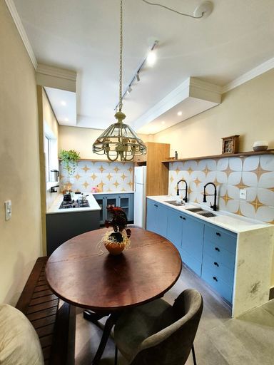 Mesa retrô com banco e cadeiras