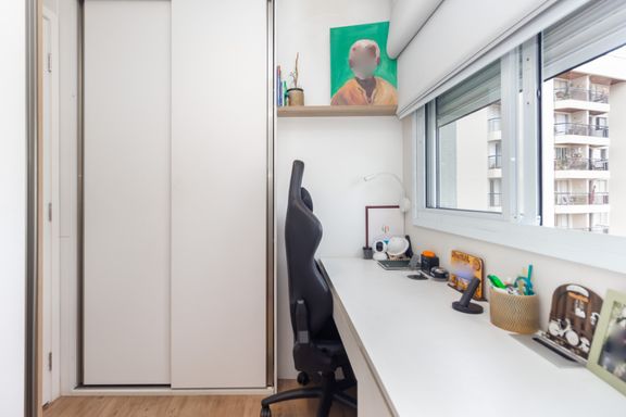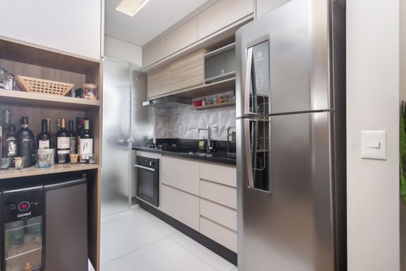 A cozinha é moderna e funcional, com ótimo aproveitamento de espaço, bancadas bem planejadas e infraestrutura para eletrodomésticos que facilitam a rotina. A área de serviço é integrada e bem organizada, oferecendo praticidade sem comprometer o layout do apartamento.