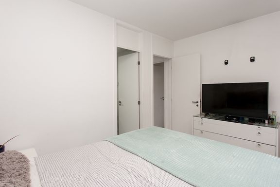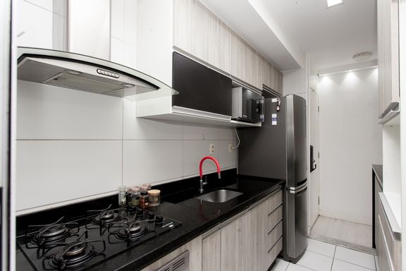 A cozinha é no estilo americano, integrada à sala, com móveis planejados que otimizam o espaço e agregam modernidade ao ambiente. A sala já conta com rack instalado, pronta para receber seus momentos de lazer.