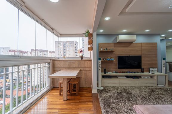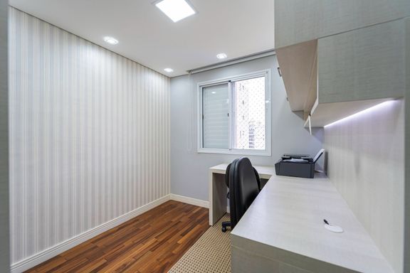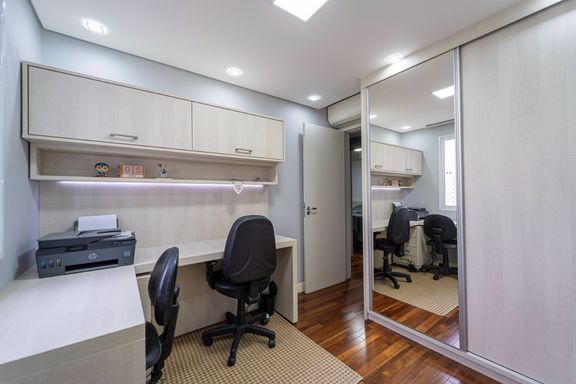 A planta é bem distribuída, com cozinha integrada à sala de estar, criando um ambiente moderno e funcional, perfeito tanto para o dia a dia quanto para receber amigos e familiares. A varanda é espaçosa, e o imóvel conta com móveis planejados, iluminação embutida e ar-condicionado instalado na sala, na suíte e no escritório, garantindo conforto térmico em todos os ambientes principais.