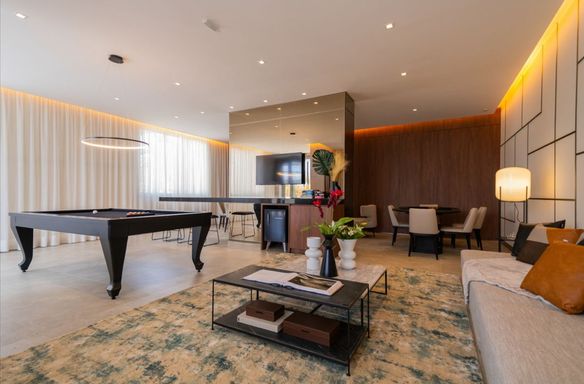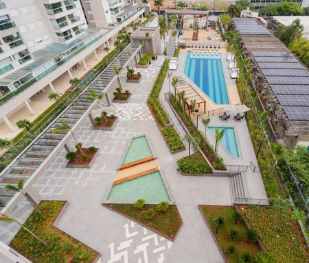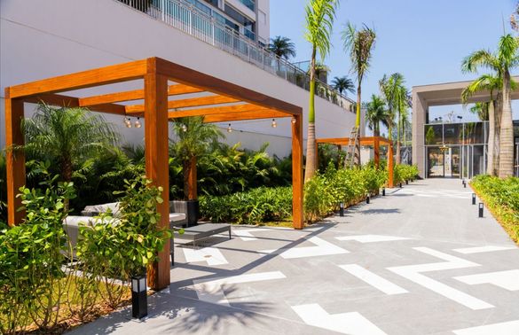 Hall social, lobby, piscina com raia de 25 m, piscina infantil, deck molhado, solarium, lounge bar, praça com espelho d água, estar externo, estar sob pergolado, churrasqueiras com forno de pizza, espaço Gourmet, terraço gourmet, lounge festas, sauna/ descanso, academia, sala de spinning, sala para aulas de ginástica, quadra recreativa, mini quadra recreativa, pet place, horta, redário, grand playground, brinquedoteca, sala de jogos e coworking.