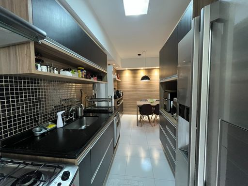 A sala de estar integrada à sala de jantar se abre para uma bela varanda gourmet bem espaçosa e com vista livre do bairro, Um ótimo espaço ao ar livre para desfrutar de muito verde e bem-estar.