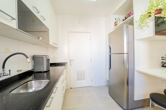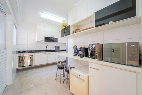 O imóvel conta com três dormitórios, sendo uma suíte, lavabo, varanda gourmet com churrasqueira a carvão e duas vagas de garagem. A planta é bem distribuída e o apartamento foi reformado, oferecendo conforto e praticidade para toda a família.
