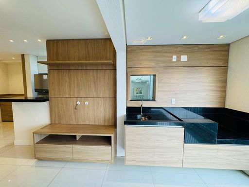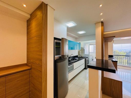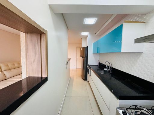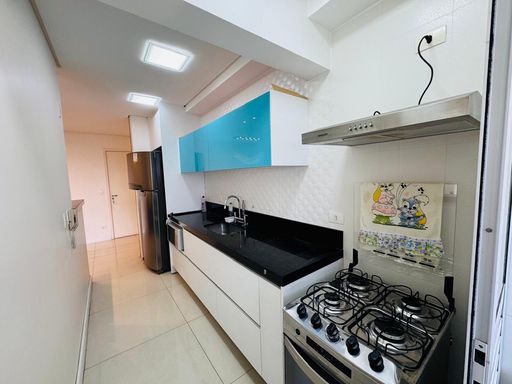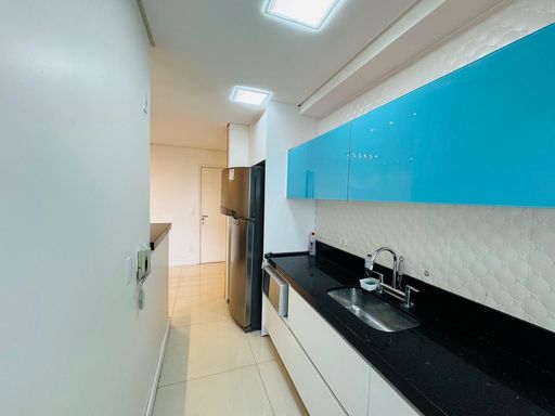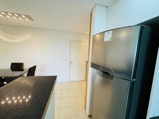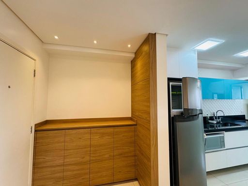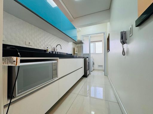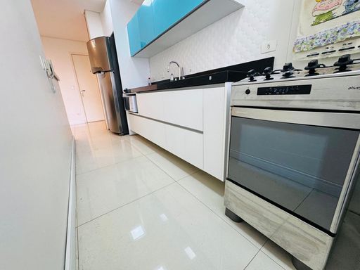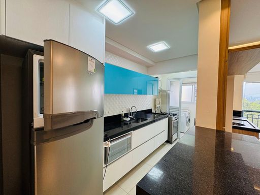 • Cozinha equipada com geladeira, micro-ondas e armários planejados
