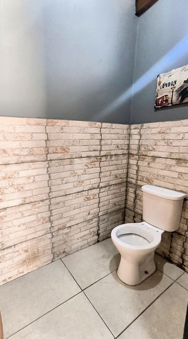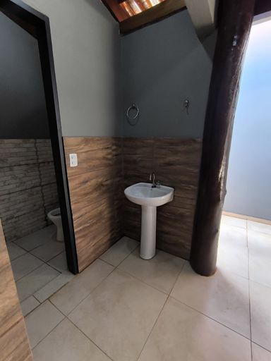 Banheiro social equipado com gabinete e box de vidro
