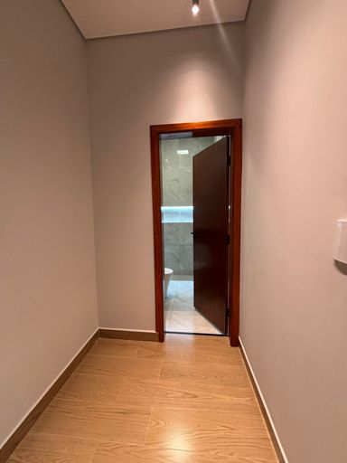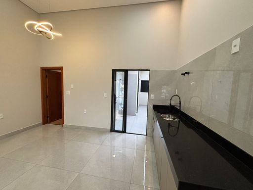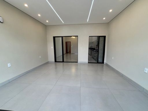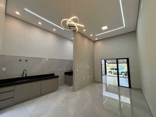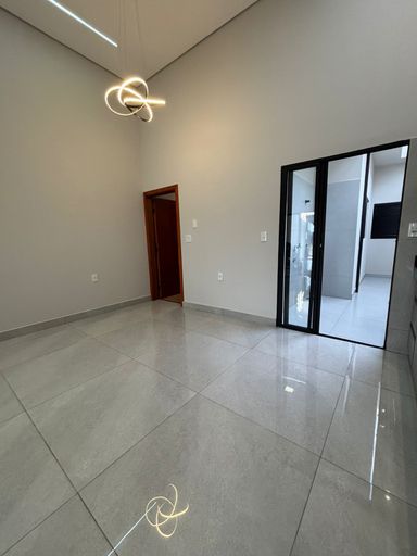 - Sala com pé-direito alto e iluminação em LED integrada.