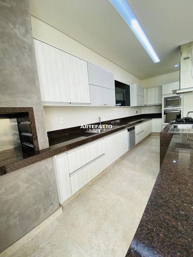 Residência com três suítes amplas, escritório, salas integradas, lavabo, cozinha gourmet, piscina aquecida e garagem para 4 carros.