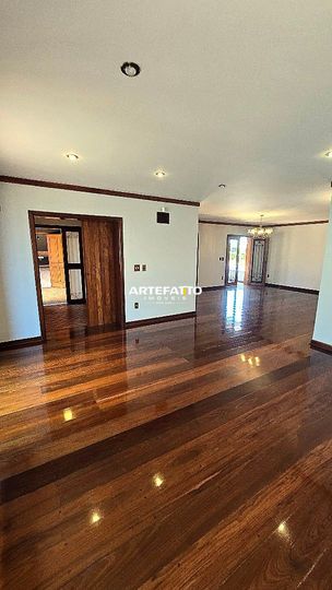 PAVIMENTO TÉRREO: - Hall de entrada com lavabo - 2 amplas salas integradas - Sala privativa com banheiro - Ampla cozinha com móveis planejados - Dispensa - Lavanderia - Ampla área de churrasco - Amplo terraço com jardins, piscina, sauna e banheiro - Garagem para 6 veículos