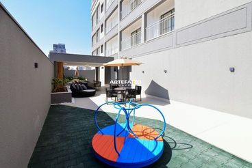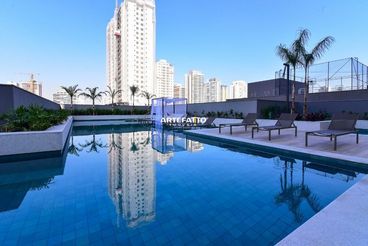 O condomínio oferece lazer completo: piscina adulto com raia, piscina infantil, deck molhado, salão de festas gourmet, espaço fitness, sala de jogos, brinquedoteca, espaço delivery, mini market, hall social e áreas externas com paisagismo.