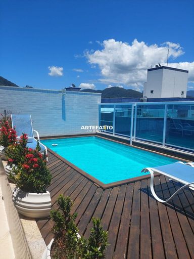 O condomínio ainda oferece uma área de lazer com piscina, 2 churrasqueiras, 2 lavabos e ducha, além de espreguiçadeiras e mesas e bancos em madeira.
