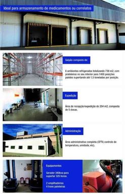 Galpão com câmara fria com 6 ambientes de temperatura com 1400 posições paletes, área de recepção e expedição de notas com 204m2 composta com 5 Docas, Esta estrutura já foi utilizada para armazenar distribuir medicamentos e correlatos.